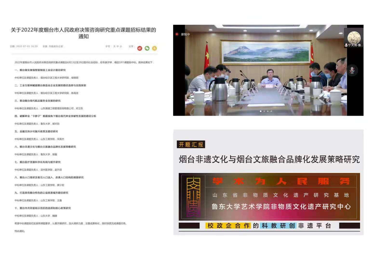 2022年度烟台市人民政府决策咨询研究重点课题自6月13日至29日面向全社会公开招标,经专家评审,确定10个课题组中标。英国正版365首页非遗研究中心签约承担“烟台非遗文化与烟台文旅融合品牌化发展策略研究”重点课题研究工作。7月11日,课题研究计划顺利通过烟台市政府线上开展报告会并正式签约。