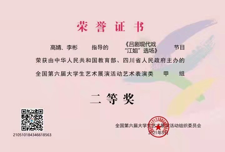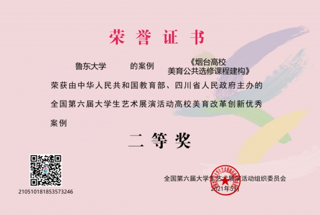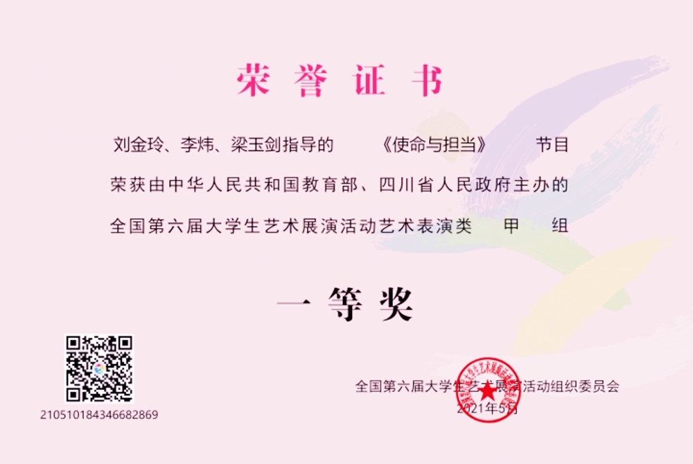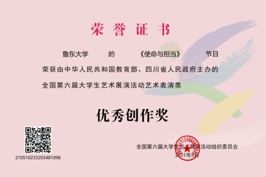 56-13日,全国第届大学生艺术展演活动成都举行。刘金玲、李炜、梁玉剑老师指导的朗诵《使命与担当》荣获艺术表演类甲组一等奖、优秀创作奖,高婧、李彬老师指导的《吕剧现代戏——“江姐”选场》获得艺术表演类甲组二等奖,唐雯老师的《烟台高校美育公共选修课程建构》荣获高校美育改革创新优秀案例二等奖,学校荣获优秀组织《使命与担当》作为山东省代表团第一次参加全国大艺展现场展演的朗诵类节目参加了现场展演。