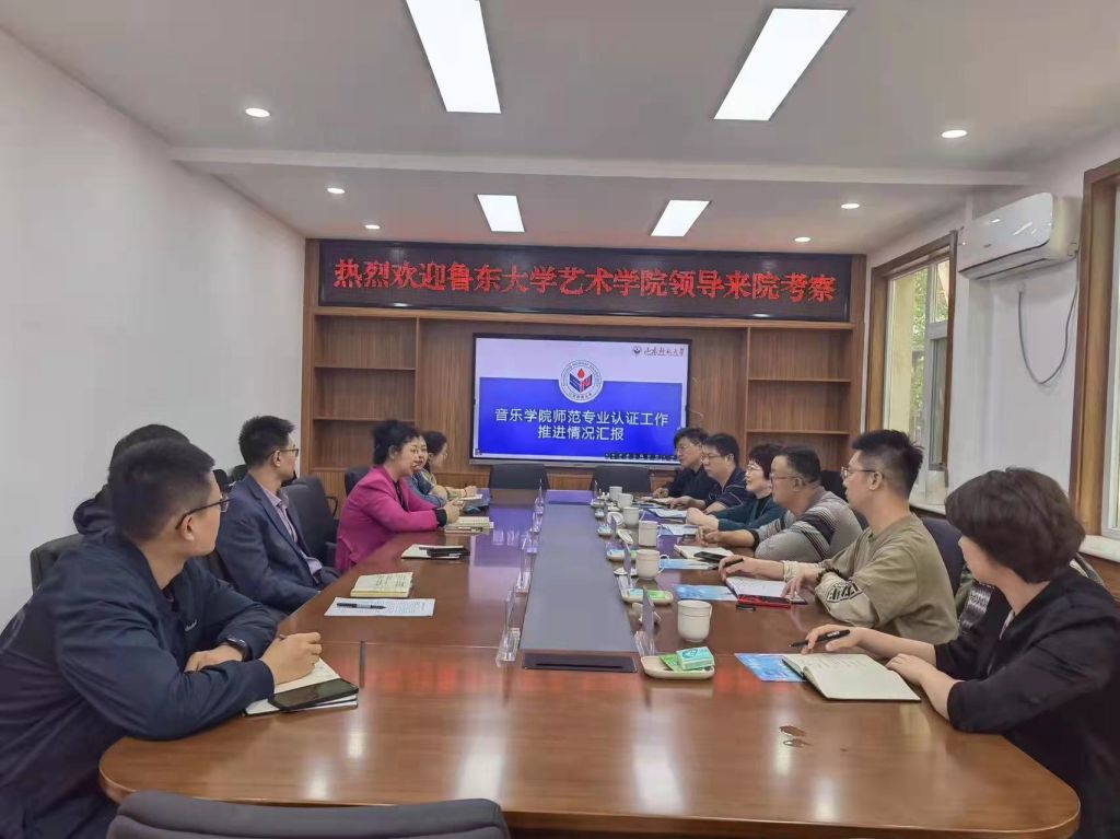 此次学习交流活动受到山东师范大学音乐学院的热情接待,王国宁书记对山师音乐学院的办学历史和近些来所取得的发展成就进行介绍,副院长宋春燕教授以及承担认证具体分工的相关负责人先后对该院师范类专业认证工作的推进过程以及办学管理的成功经验进行了深入详实的介绍与分享。双方就培养目标、毕业要求、课程教学、合作实践、保障体系、学生成长等认证工作的具体内容、实施细则以及工作推进中重点存在的实际问题进行了互通交流。随后,双方就教学管理、学科专业建设、研究生培养、教学科研成果培育等方面也逐一进行了深入交流。通过此次学习交流,增进了两校之间的专业共建与资源共享,为积极拓展多方面交流合作,提升人才培养质量和学科专业发展等方面提供了坚实保障。