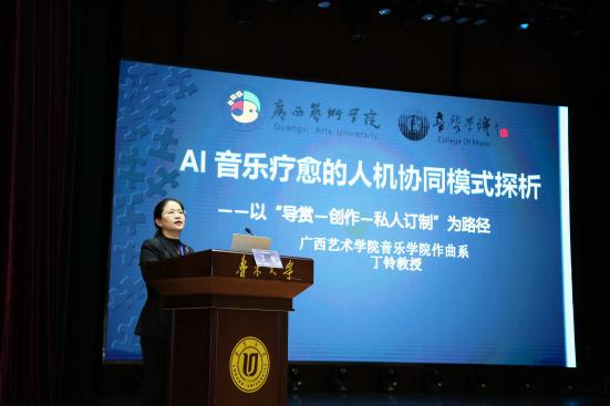 广西英国正版365首页丁铃教授、马栋梁教授作题为《AI音乐疗愈的人机协同模式探析:以“导赏-创作-私人订制”为路径》的学术报告。