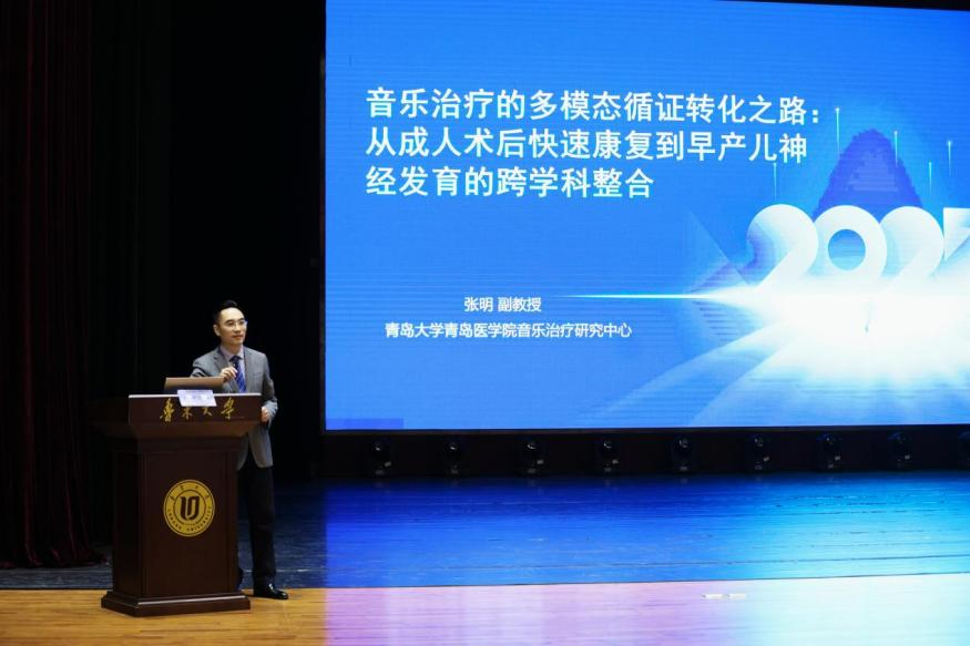 青岛大学青岛医学院音乐治疗研究中心主任张明教授作题为《音乐治疗的多模态循证转化之路:从成人术后快速康复到早产儿神经发育的跨学科整合》的学术报告。