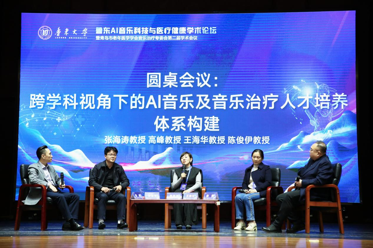 张海涛教授、高峰教授、王海华教授、陈俊伊教授、张明教授共同探讨《跨学科视角下的AI音乐及音乐治疗人才培养体系构建》的议题