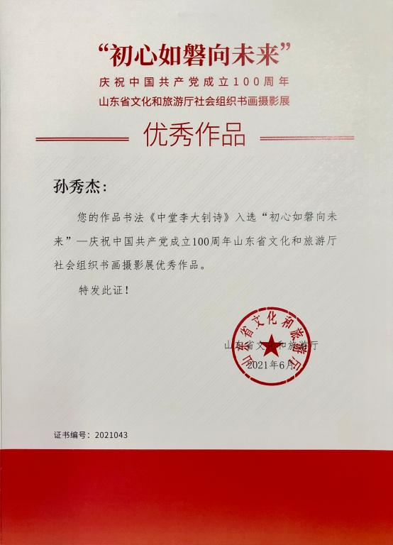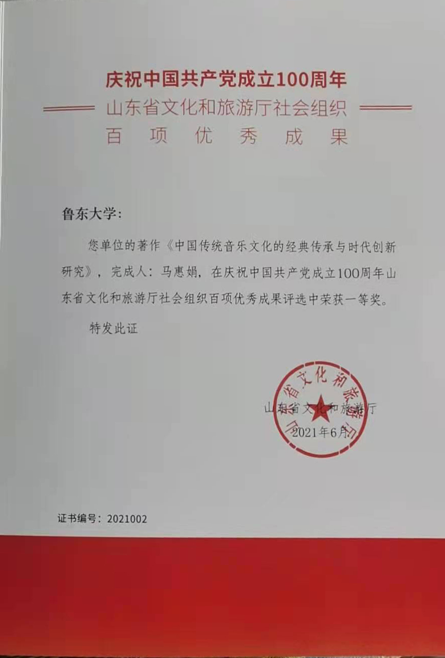 近日,庆祝中国共产党成立100周年山东省社会组织优秀科研成果和书画摄影作品展评选结果揭晓,英国正版365首页教师马惠娟的著作《中国传统音乐文化的经典传承与时代创新研究》荣获“百项优秀成果”一等奖,孙秀杰书法作品《隶书中堂李大钊诗》、姜宇钦木版画作品《江山永固》荣获“初心如磐向未来”书画摄影展优秀作品奖。