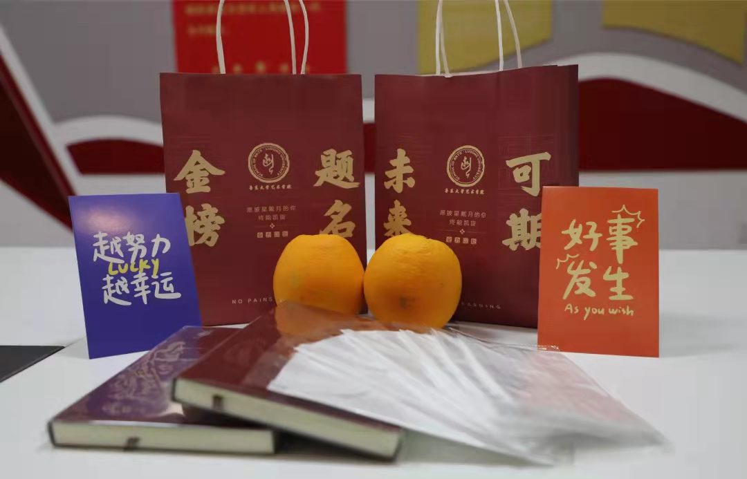 一只定制的手提袋上印有学院的院徽和金榜题名、未来可期字样,希望考研学子们在考场披荆斩棘、攻克难关、成功上岸;打开手提袋里面有两枚橙子、笔记本、口罩、棒棒糖以及印有“成功上岸”等祝福字样的明信片。这份暖心礼包,从手提袋的设计定制、文具的精心挑选,到水果的选购,再到装袋、摆放,整个过程都饱含了学院对所有考研学子的深深祝福。