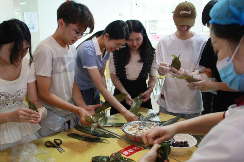 在食堂工作人员的指导下,同学们亲手体验各种包粽子方法,既分工又合作,说笑中体验着制作美食的快乐,经过两个小时的努力,糯米变成了一个个满怀情义的粽子。大家还互相交流各自家乡的端午节习俗,感受中华传统文化的源远流长。
